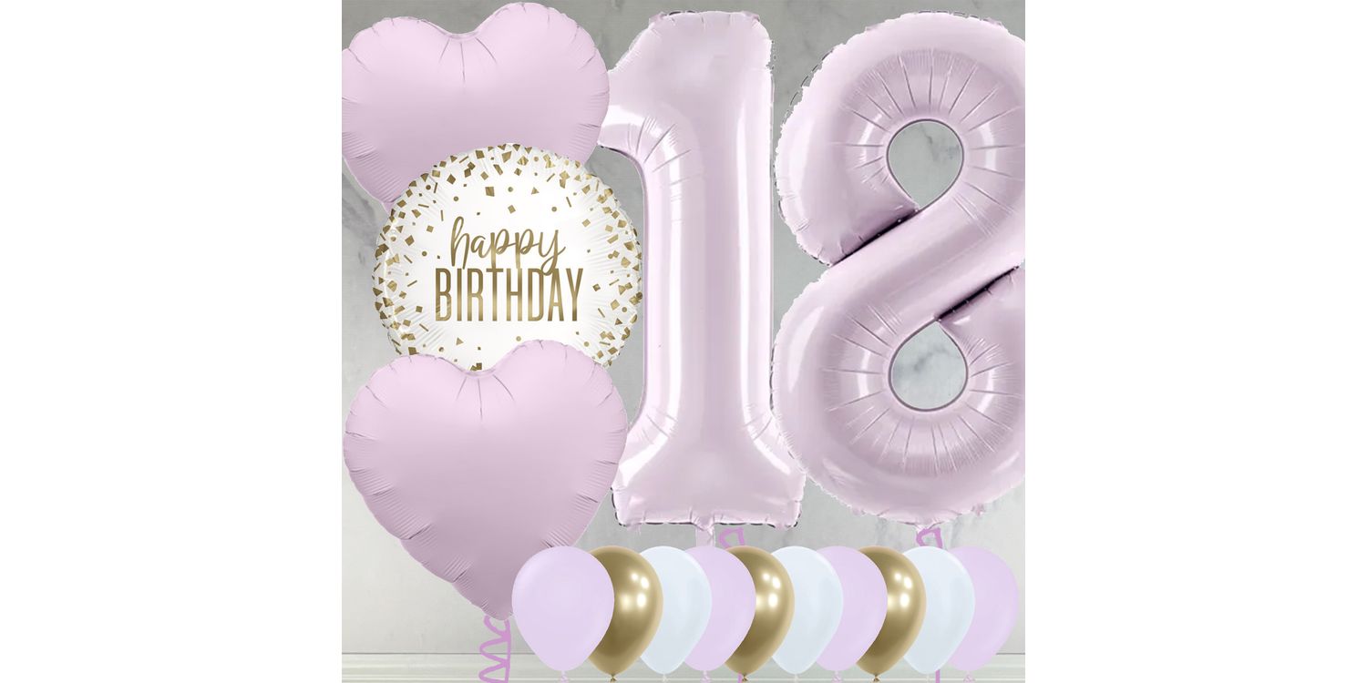 The 18th balloon package includes two 26" lilac foil balloon numbers filled with helium, plus our special foil balloon bunch including a 'Happy Birthday' design.
