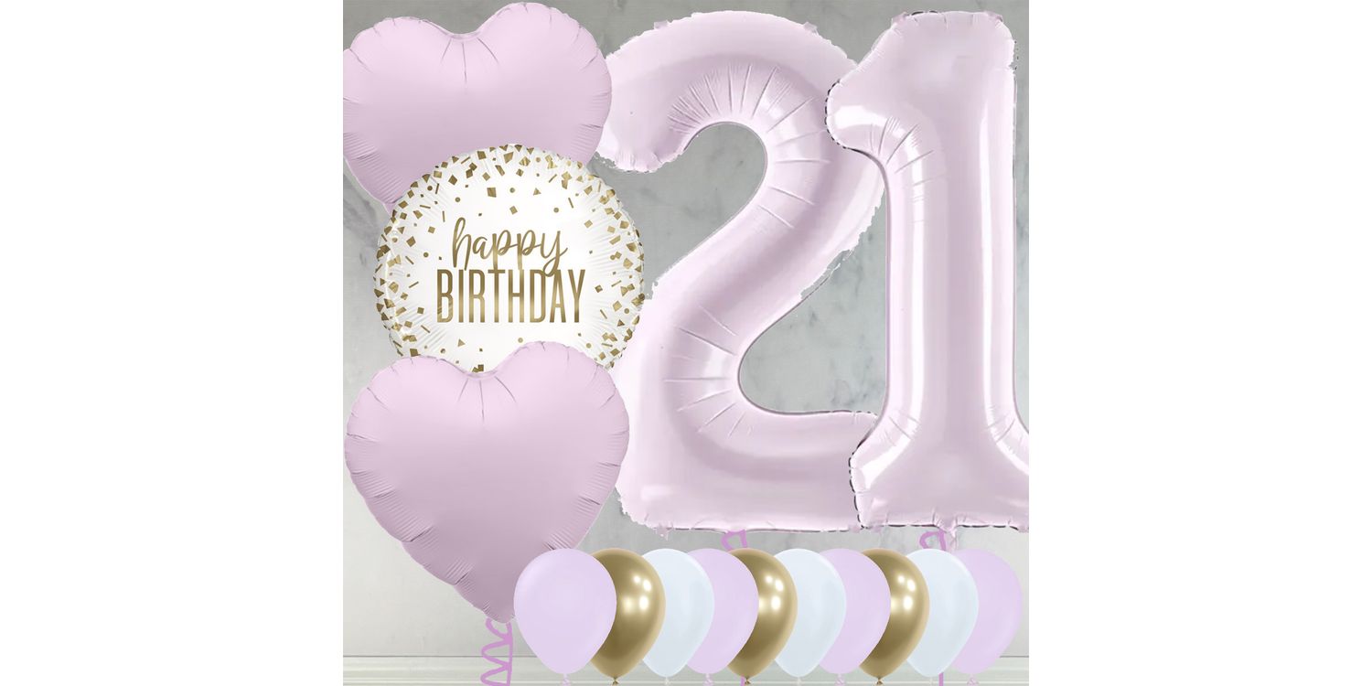 The 21st balloon package includes two 26" lilac foil balloon numbers filled with helium, plus our special foil balloon bunch including a 'Happy Birthday' design.