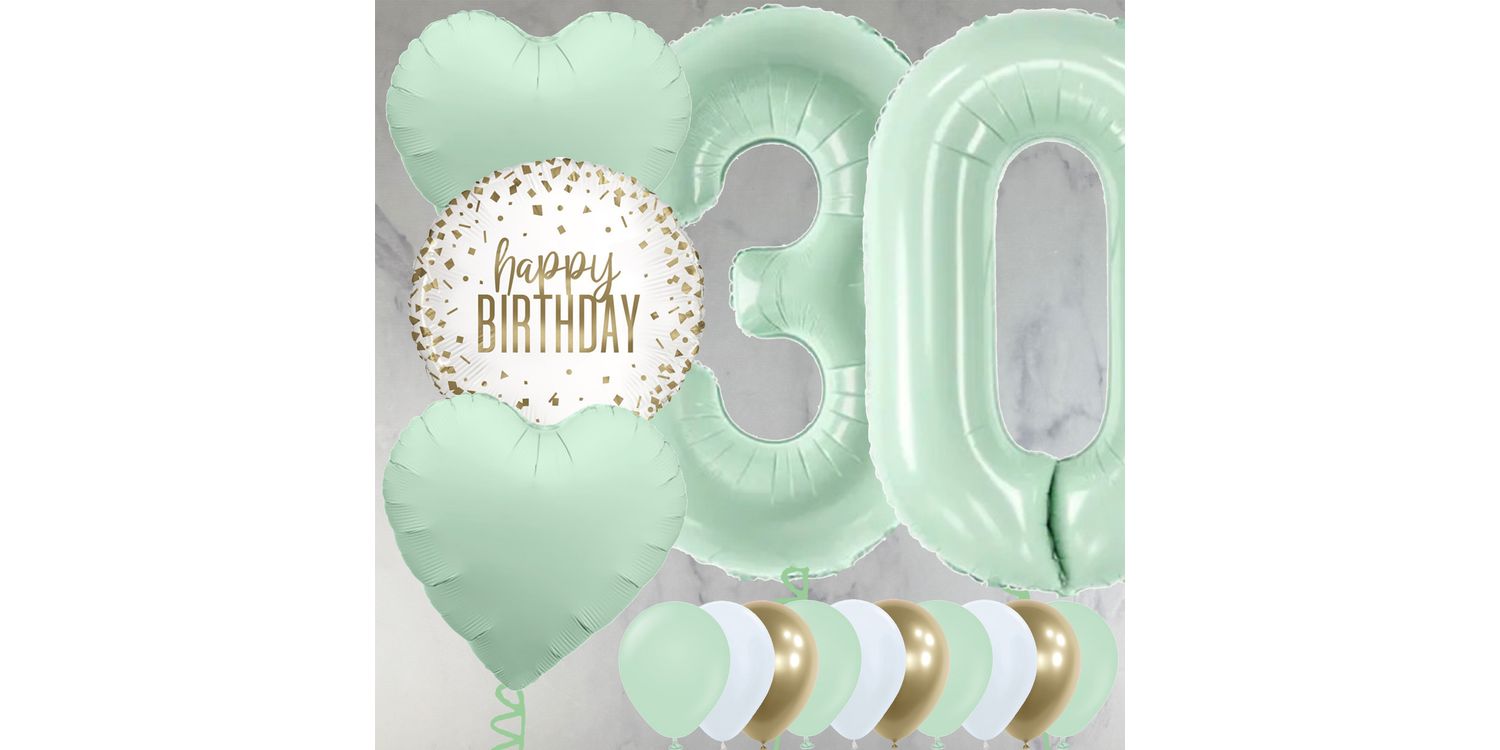 The 30th balloon package includes two 26" mint green foil balloon numbers filled with helium, plus our special foil balloon bunch including a 'Happy Birthday' design.