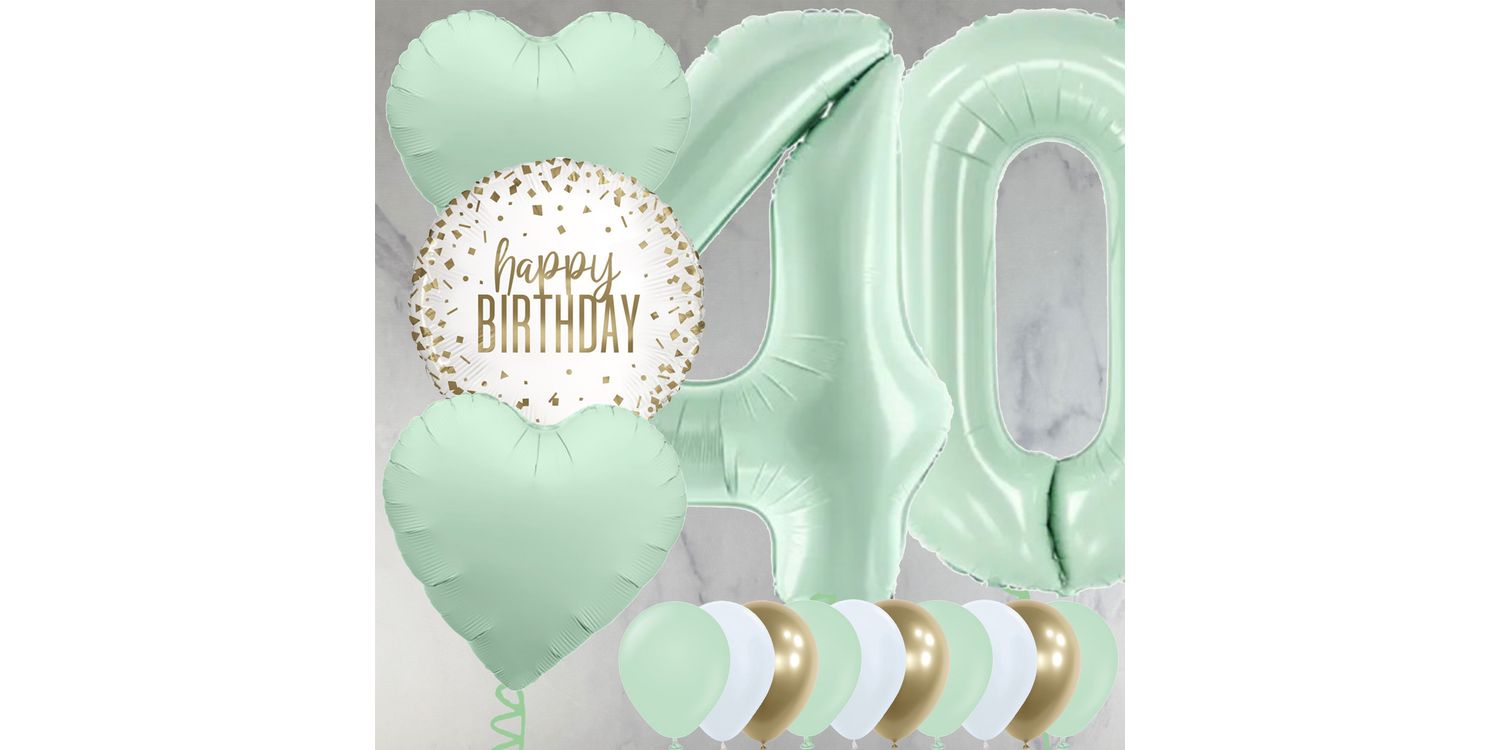 The 40th balloon package includes two 26" mint green foil balloon numbers filled with helium, plus our special foil balloon bunch including a 'Happy Birthday' design.