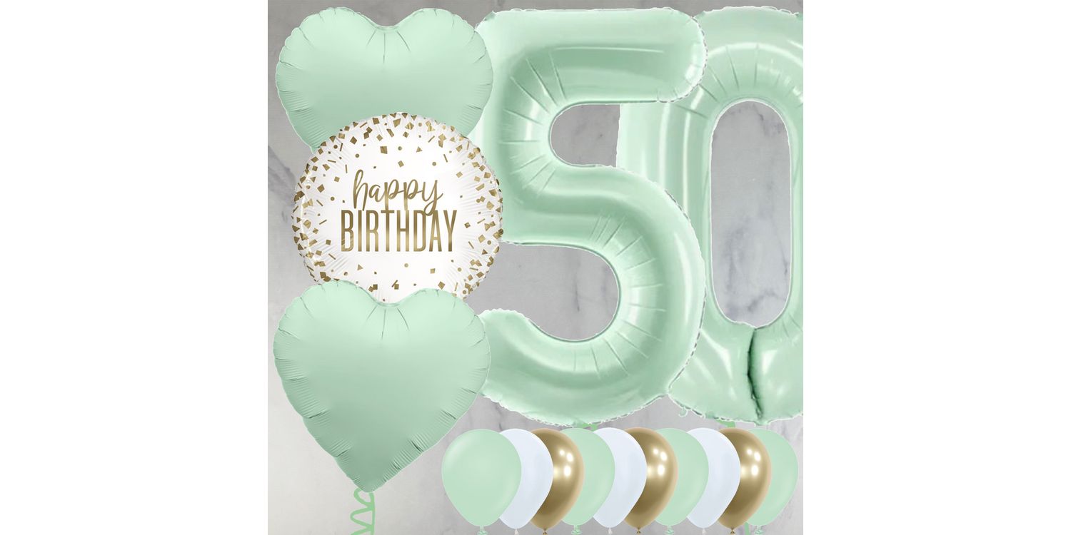 The 50th balloon package includes two 26" mint green foil balloon numbers filled with helium, plus our special foil balloon bunch including a 'Happy Birthday' design.