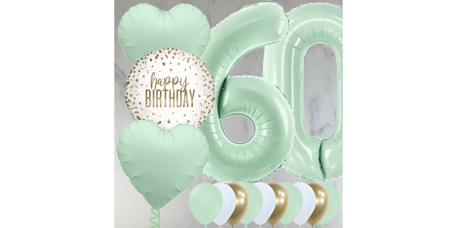 The 60th balloon package includes two 26" mint green foil balloon numbers filled with helium, plus our special foil balloon bunch including a 'Happy Birthday' design.