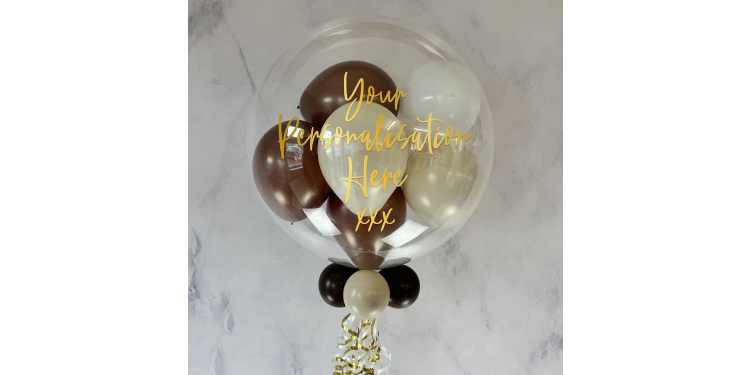Hot chocolate is our trending colour set and is ideal for any occasion. Warm chocolate tones mixed with satin cream and white make for a classy look which can be finished with your personalisation in a selection of fonts and colours. The clear 20" outer balloon provides the ideal base for a selection of trending balloons to shine inside, with space on the outside for your own wording or message.