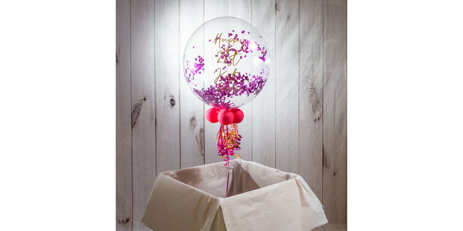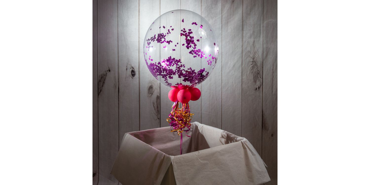 To create this striking decoration, we inflate a 20" outer balloon and fill it with biodegradable small square powder confetti, finished off with mini balloons and ribbons around the base. A weight is then added to keep your decoration anchored in the box.
