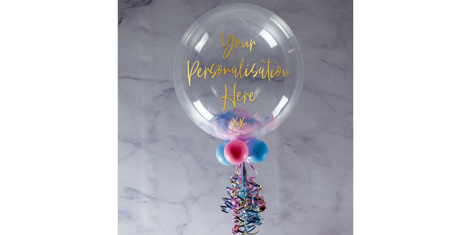 Personalised Baby Pink, Baby Blue & White Feather Bubble Balloon