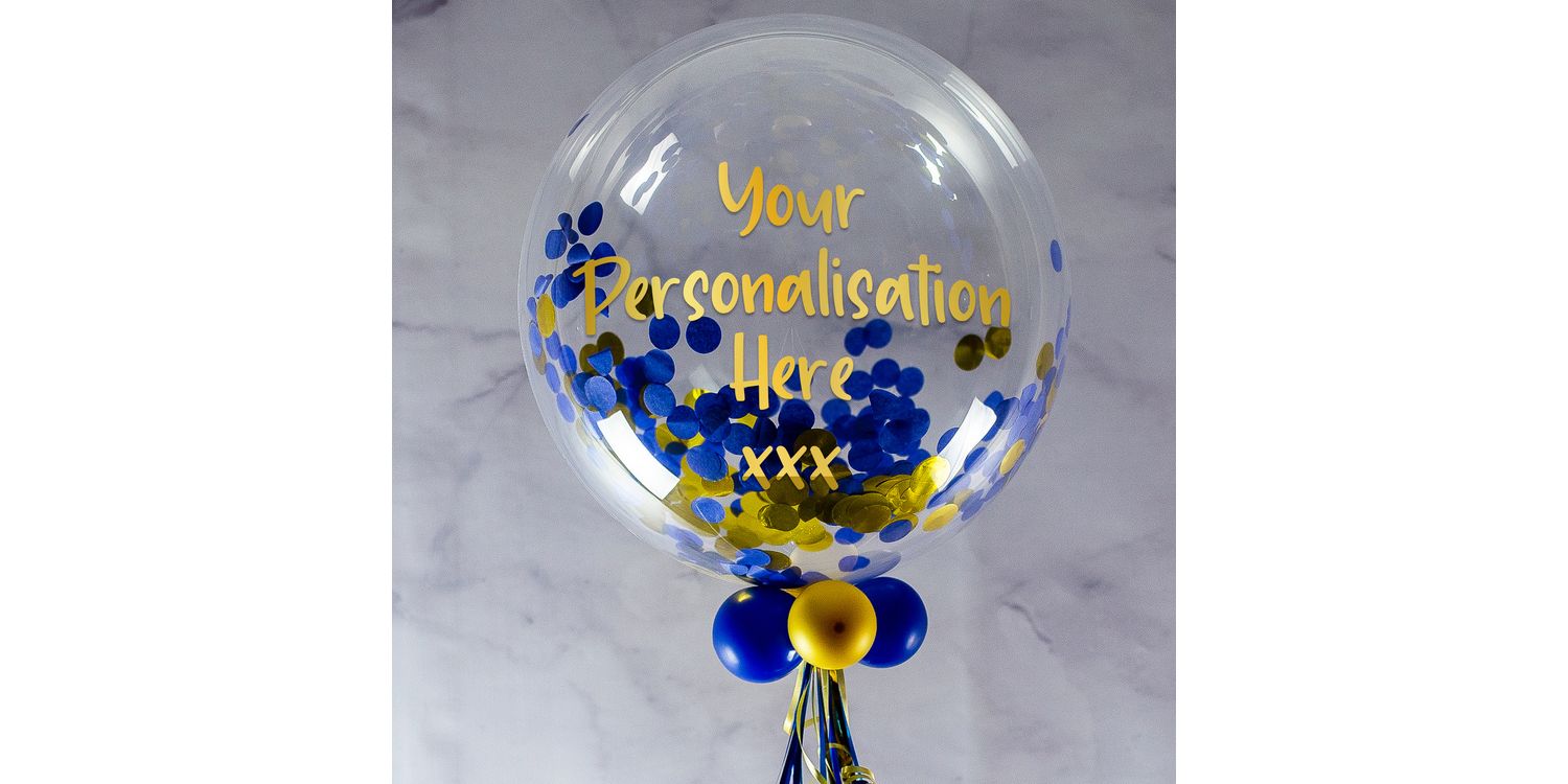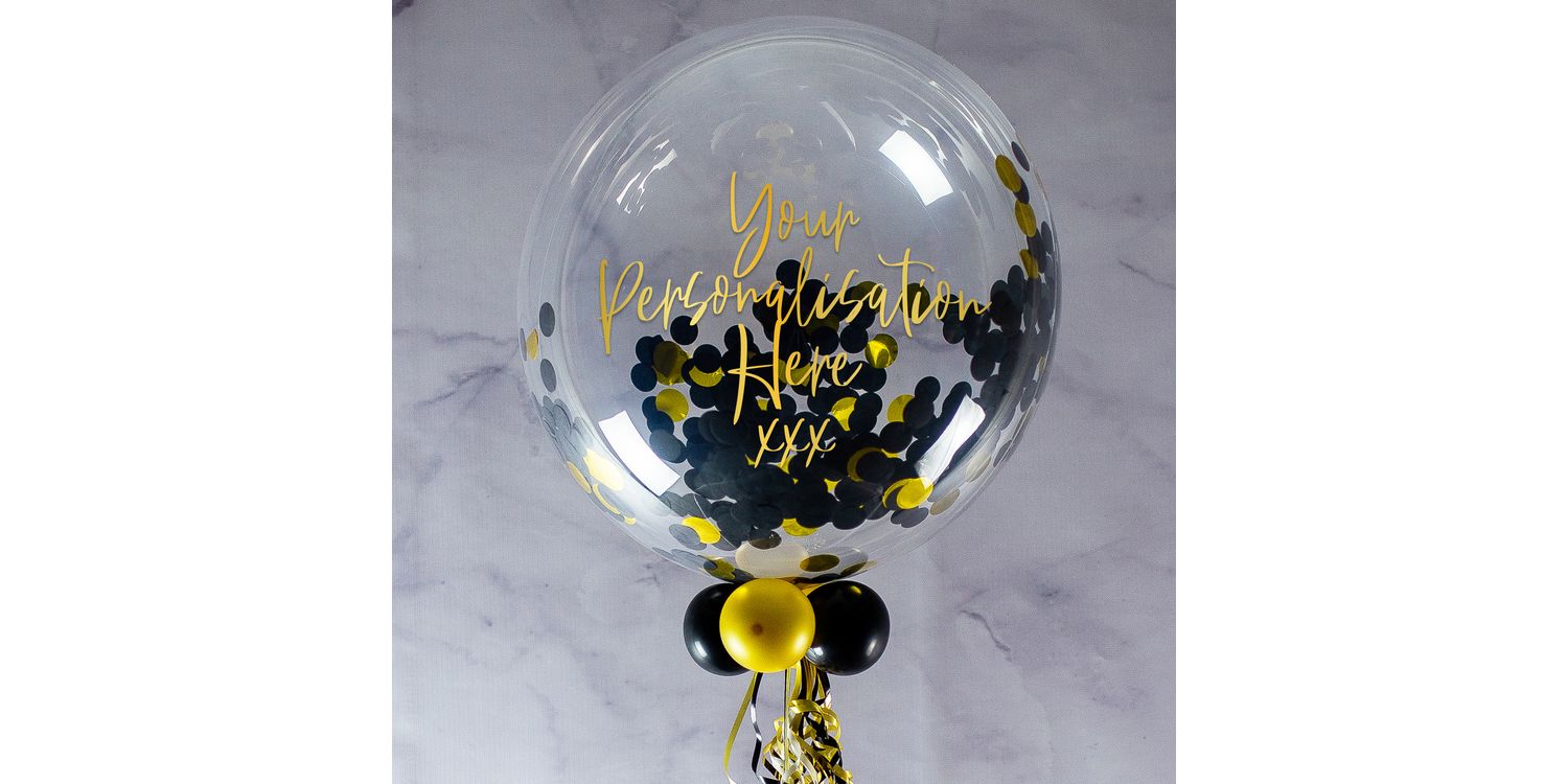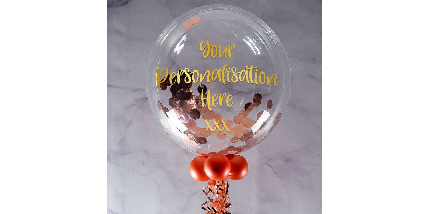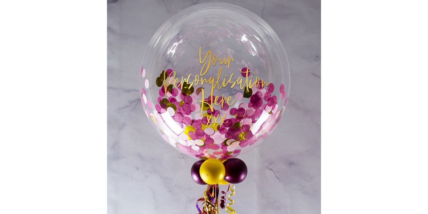 We inflate a clear plastic balloon, insert confetti, then add four small balloons to the base of the balloon and add colour co-ordinated ribbons and weight.
