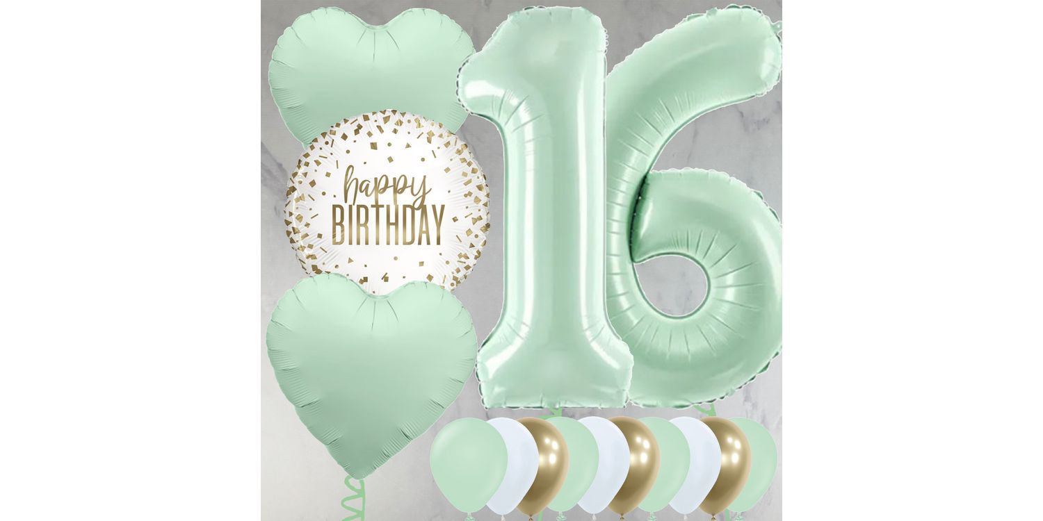 Make it a birthday to remember with our mint green foil numbers balloon package, a great gift and decoration for a 16th birthday celebration.