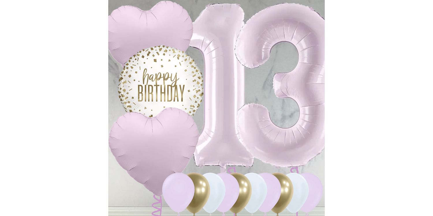 The 13th balloon package includes two 26" lilac foil balloon numbers filled with helium, plus our special foil balloon bunch including a 'Happy Birthday' design.