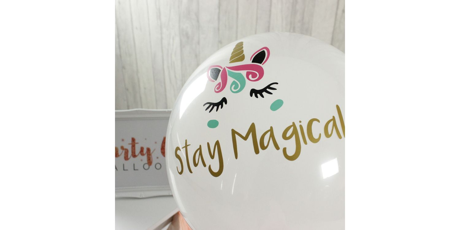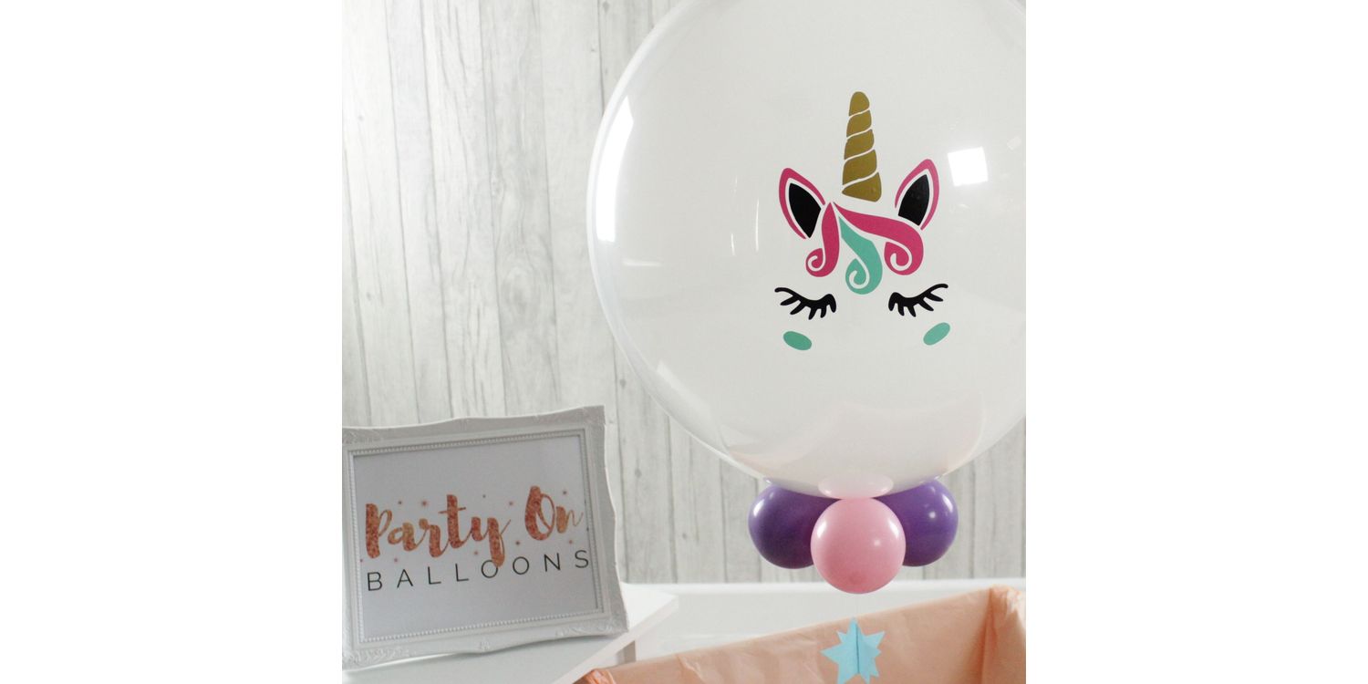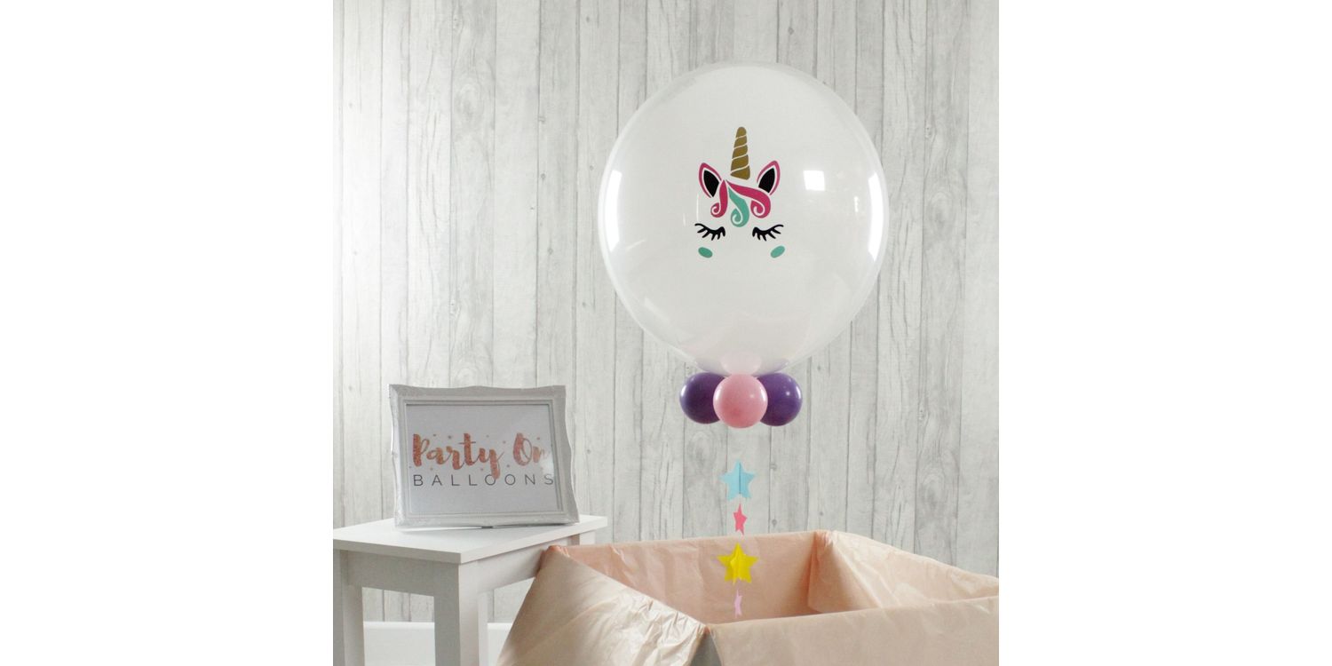 One of our very best balloons to give as a gift, this is a 20" bubble balloon with a large white balloon inflated inside. We add four small balloons around the base, our special pastel coloured star ribbon and finish it off with our multi coloured vinyl unicorn face along with personalisation of your choice.